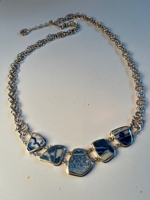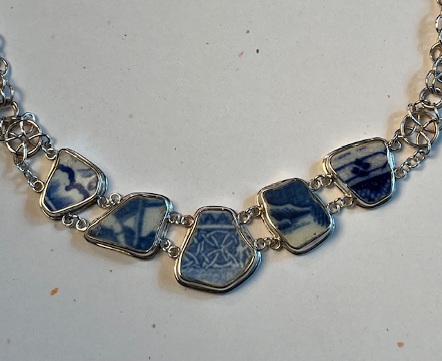 The banks of the Thames contain broken clay pipes and pottery shards dating back hundreds of years. Gathering this detritus and occasionally treasures from the shores is known as mudlarking. A friend in London who took up mudlarking gifted me with many pottery shards. These pieces incorporate the shards into jewelry.